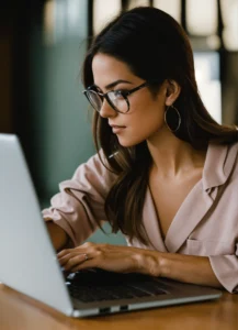 Mujer trabajando en una laptop. En el escritorio u